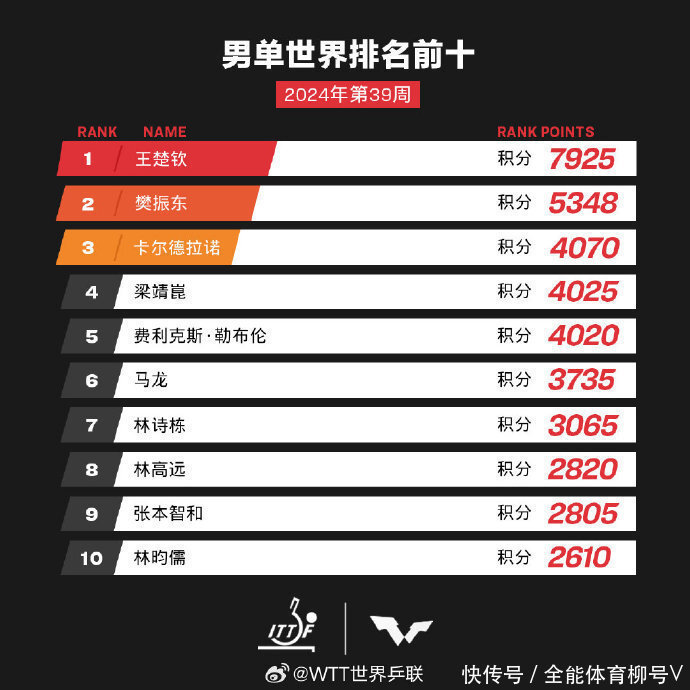 外洋乒联2024年第39周男人单打宇宙排行,中国选手共有6东说念主插足前10,其中,“大头”王楚钦高居第1,在巴黎奥运会勇夺男单冠军的樊振东高居第2,“大胖”梁靖崑排在第4,“全满贯”马龙排在第6,近期连夺4冠的小将林诗栋排在第7,景色转机不定的林高远排在第8。