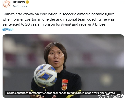 点击输入图片态状(最多30字)除了韩媒对李铁一事进行了关心,宇宙闻明的路透社也对李铁被判刑一事进行了报谈。路透社在报谈此事时暗示:“中国在足球鸿沟的反腐行径遭灾到一位闻明东谈主物,前埃弗顿中场球员、国度队训诫李铁因贿赂和纳贿被判处20年扣留。”从路透社的报谈中不错看到,曾在英超踢过球的李铁,在欧洲足坛还是有一定的闻明度。","del":0,"gnid":"9e0558d866d79c550","img_data":[{"flag":2,"img":[{"desc":"","height":"682","title":"","url":"http://p0.img.360kuai.com/t11fd4c33014e200c775a111ccf.png","width":"1024"},{"desc":"","height":"785","title":"","url":"http://p0.img.360kuai.com/t11fd4c3301db3e7900a3fe54a5.png","width":"823"},{"desc":"","height":"500","title":"","url":"http://p0.img.360kuai.com/t11fd4c3301e59b7e4c53ef9fe0.png","width":"750"},{"desc":"","height":"683","title":"","url":"http://p0.img.360kuai.com/t11fd4c3301ca3b797b721d001a.png","width":"1024"},{"desc":"","height":"840","title":"","url":"http://p0.img.360kuai.com/t11fd4c3301436aec1582212152.png","width":"751"},{"desc":"","height":"413","title":"","url":"http://p0.img.360kuai.com/t11fd4c33018299df1af401a39e.png","width":"527"}]}],"original":"1","pat":"art_src_0,fts0,sts0","powerby":"cache","pub_time":1734078986000,"pure":"","rawurl":"http://zm.news.so.com/468c8c58c2cedc714ceb1e50145ab320","redirect":0,"rptid":"eaa724505499b8a7","rss_ext":[],"s":"t","src":"尘语者","tag":[{"clk":"ksport_1:英超","k":"英超","u":""},{"clk":"ksport_1:路透社","k":"路透社","u":""},{"clk":"ksport_1:中国男足","k":"中国男足","u":""},{"clk":"ksport_1:国度队","k":"国度队","u":""}],"title":"李铁获刑20年,望望外媒是若何报谈的","type":"zmt","wapurl":"http://zm.news.so.com/468c8c58c2cedc714ceb1e50145ab320","ytag":"体育:足球:中国足球","zmt":{"brand":{},"cert":"体育鸿沟创作家","desc":"喝茶、聊球,分享生活的魄力","fans_num":8187,"id":"1495030542","is_brand":"0","name":"尘语者","new_verify":"7","pic":"https://p9.img.360kuai.com/t01b8976b5656095ed5.jpg","real":1,"textimg":"https://p9.img.360kuai.com/bl/0_3/t017c4d51e87f46986f.png","verify":"0"},"zmt_status":0}","errmsg":"","errno":0}