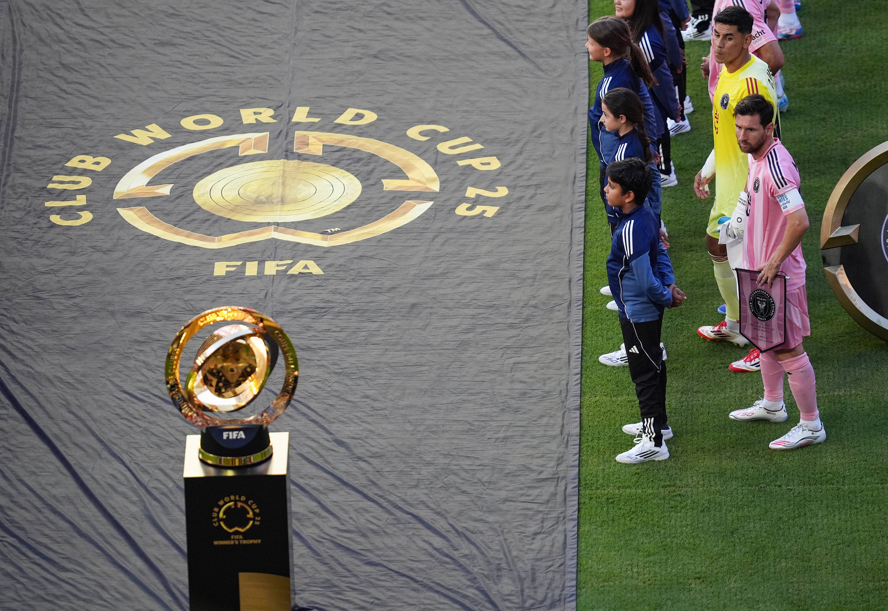 6月14日,迈阿密海外队球员梅西(右一)在比赛前望向冠军奖杯。新华社记者 黄宗治 摄“球王”梅西继2009年、2011年和2015年三夺世俱杯冠军后,第四次向该赛事冠军发起冲击。天然实力一般的迈阿密海外并非夺冠热点,但“球王”的个人魔力使得该队成为本届世俱杯的明星球队。