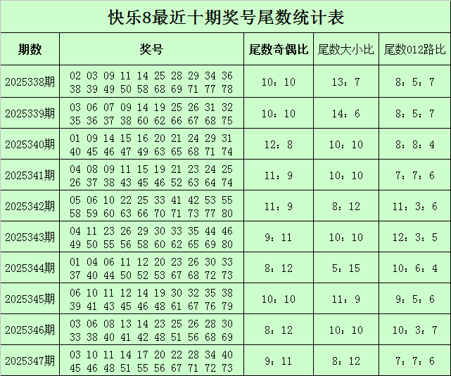 福彩情状8第2025347期开奖追思:03 10 11 14 17 20 22 28 34 40 45 46 48 51 55 56 67 71 72 73,其中奖号余数012路比为7:7:6,余数大小比为8:12,奇偶比为9:11。